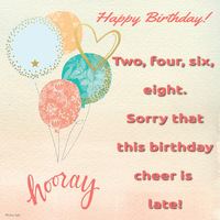 I was thinking of you yesterday, but I couldn’t remember what for. Now I do! This wish is late so that you can celebrate longer. Happy Birthday! May this be the least belated of all your belated birthday wishes. Birthdays are special days but you are special every day. Belated Happy Birthday. Even though I missed your birthday by a mile, I hope you celebrated it with smile. Even though this greeting comes to you a little late, the wish it brings for happiness is good on any day date. Belated Happy Birthday! Two, four, six, eight. Sorry that this birthday cheer is late! Happy Birthday! No doubt you got lots of birthday wishes yesterday, but who's thinking of you today? Me! Happy Belated Birthday! Sending you belated birthday wishes. Hope you had the happiest birthday ever.