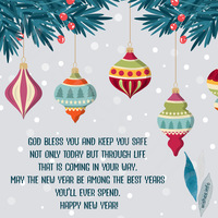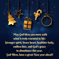 Happy New Year! Happy Holidays! Wishing you all the best for all you do in the coming year! God bless you and keep you safe not only today but through life that is coming in your way. May the New year be among the best years you’ll ever spend. Happy New Year! The first morning of the new year is about to arrive. May the rays of the rising sun bring blessings of health, wealth and happiness for everyone. I wish the best for you and your family. Happy New Year! May God bless you more with what is truly essential in life: Stronger spirit, brave heart, healthier body, endless love, and God’s grace in abundance this year. God Bless, have a great New year ahead! As the Year Last is about to end, may the best of this bring its blessings to you and to your family. A Christ-filled celebration of the New Year. Cheers to a Great New Year ! A blessing becomes a blessing when spoken. So I declare that you are blessed with a loving family, good health, faith, favor, promotion and provision. A blessed New Year to you and your family! May God’s richest blessings, truest joys, constant love, tender guidance, unfailing protection and calming peace be yours this coming Year. Happy New Year!